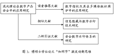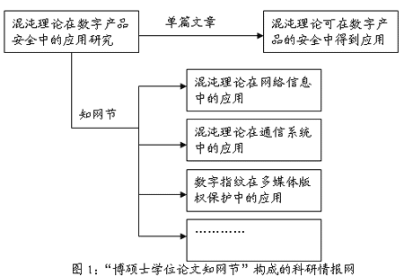 “知网节”还可以引导人们在学位论文创新成果的基础上进行拓展研究乃至跨学科研究。比如“混沌理论在数字产品安全中的应用研究”一文,创新点在于“对一种基于混沌理论的加密散列组合算法的分析与改进”。基于这种改进算法,可以设计许多应用课题,如混沌理论在数字图像信息隐藏中的应用,基于混沌理论的图像数字产品认证,基于混沌理论的若干数字产品安全交易方案等。其实,这篇文章的应用还可以派生出更多分支。