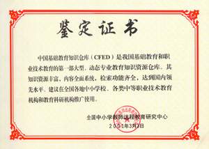 全国中小学教师远程教育研究中心根据中国学术期刊(光盘版)电子杂志社清华同方光盘股份有限公司的申请,邀请有关教育专家组成评议委员会,于2001年3月3日对该电子杂志 社和公司研制的中国基础教育知识仓库(CFED)进行了评议。评议委员会听取了该知识仓库研发的技术报告、研究报告和用户报告,并观看了CFED的演示。经过认真的评议,一致认为: