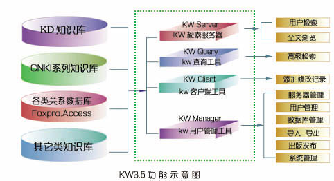 Server检索服务器、Query数据查询工具、Client数据库客户端维护工具、Manager用户管理工具四大模块组成(参见KW3.5功能示意图)。
