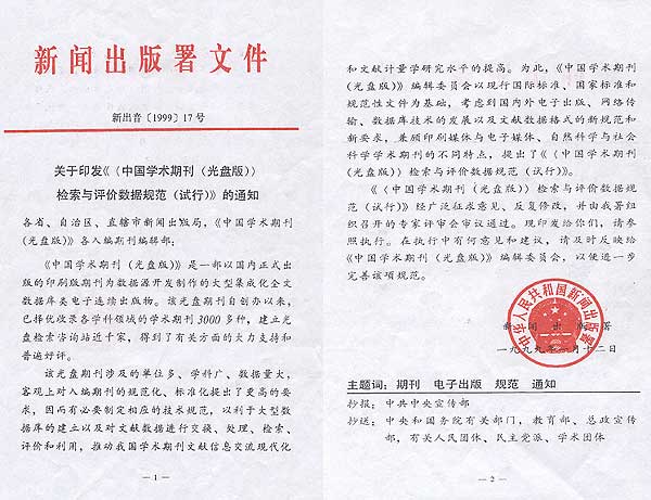 国家新闻出版署颁发新出音[1999]17号文件,执行"中国学术期刊(光盘版)检索与评价数据规范"。图片 |