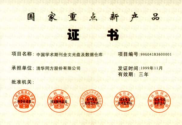 国家科技部、国家税务总局、国家对外贸易经济合作部、国家质量技术监督局、国家环保总局等五部委将CAJ-CD评为"国家重点新产品"重中之重项目。 图片 |