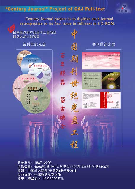 中国学术期刊(光盘版)电子杂志社和 TTOD宣布启动中国期刊"世纪光盘"工程,在2002年底之前,将我国4000多种重要期刊自创刊以来的全部文献资料进行数字化集成整合,一举建成完备的高质量期刊数据库。